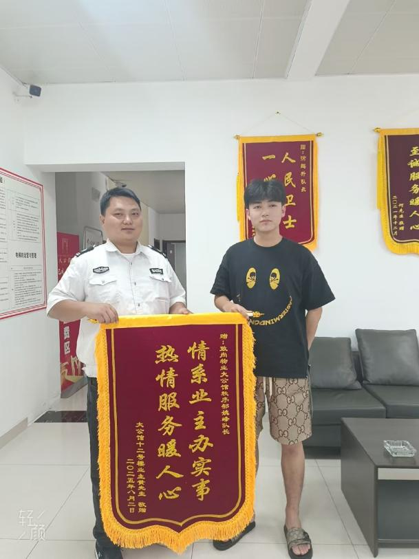 8月,大公館小區(qū)物業(yè)服務(wù)中心內(nèi)暖意融融。業(yè)主黃先生送來(lái)一面寫著“情系業(yè)主辦實(shí)事,熱情服務(wù)暖人心”的錦旗,感謝秩序部隊(duì)長(zhǎng)姚峰幫忙找回丟失財(cái)物。業(yè)主金女士也將一面寫著“人民衛(wèi)士,一心為民”的錦旗鄭重地送到保安隊(duì)長(zhǎng)徐鵬升手中,衷心感謝他通過(guò)監(jiān)控追蹤,成功抓獲小偷,為自己追回了被盜財(cái)物。安保團(tuán)隊(duì)以實(shí)際行動(dòng)詮釋著“服務(wù)業(yè)主”的宗旨,讓業(yè)主們感受到了家一般的溫暖。